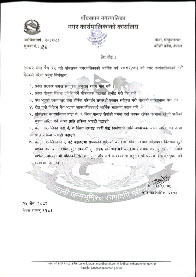 प्रेस नोट- नगर कार्यपालिकाको मिति २०८०/१२/२० को महत्वपूर्ण निर्णयहरु ।