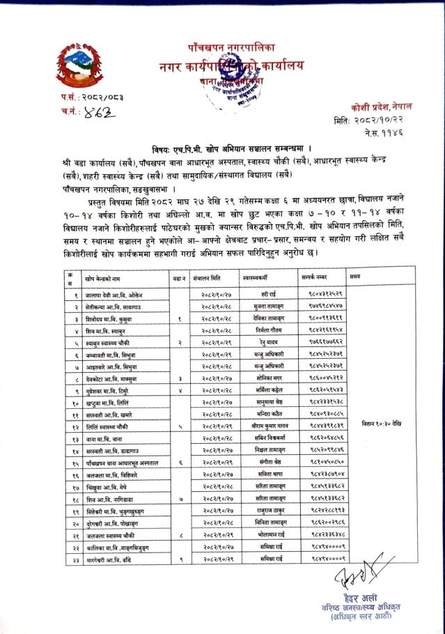 एच. पि. खोप संचालन सम्बन्धमा । श्री पत्रमा उल्लिखित सबै ।