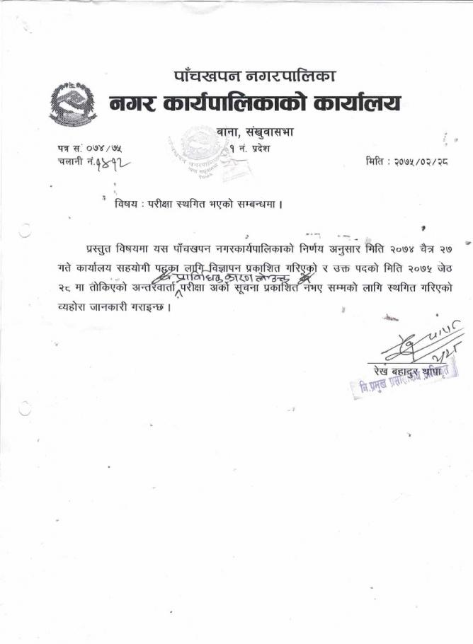 कार्यालय सहयाेगी पदकाे ०७५/०२/२८ हुने भनिएकाे परीक्षा अर्काे सुचना प्रकाशित नभएसम्म स्थगित भएकाे छ ।