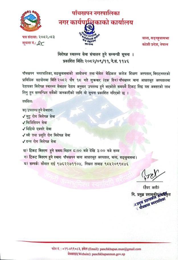 विशेषज्ञ स्वास्थ्य सेवा संचालन हुने सम्बन्धी सूचना ।