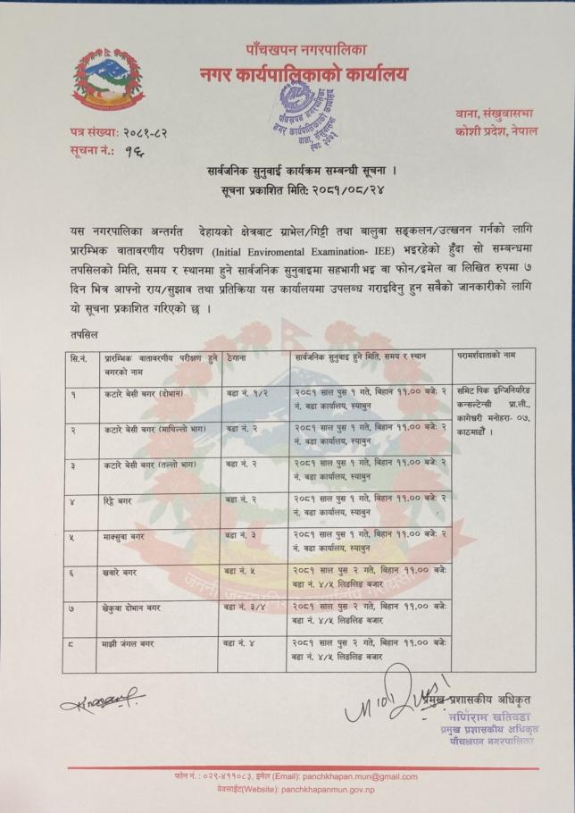 सार्वजनिक सुनुवाई हुने सम्बन्धी सूचना ।
